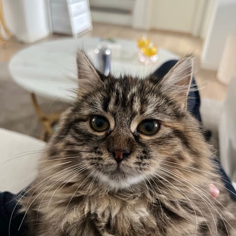 Hun er en blanding af Maine Coon og Tyrkisk Angora, og det ses tydeligt på hendes flotte, lange og let pjuskede pels samt hendes fine udtryk. Hun har en meget blød pels og et charmerende look.
