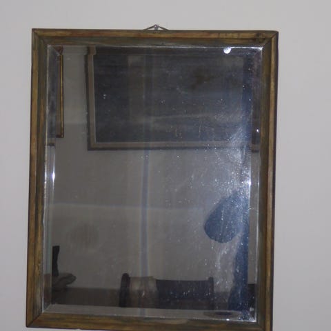 Kvadratisk vægdekoration med integreret spejl og labyrintlignende mønster i guldfarvet ramme. Dekorationen fungerer både som spejl og som grafisk vægkunst og kan anvendes i fx stue, entré eller soveværelse. Monteres direkte på væggen. Arabisk skrift (aytal kursi)