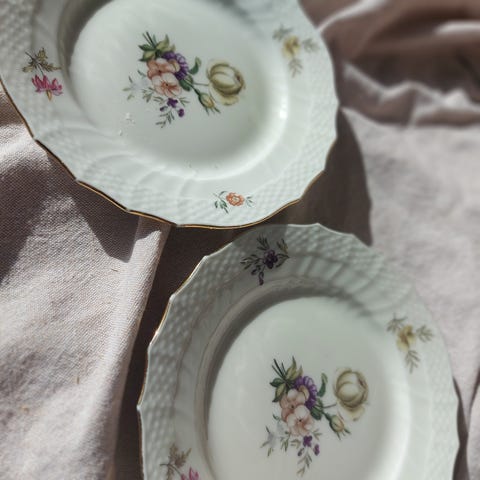 Tallerkenerne er runde og fremstillet i porcelæn med hvid bundfarve, grøn kantlinje og gule blomster med grønne blade som dekoration.