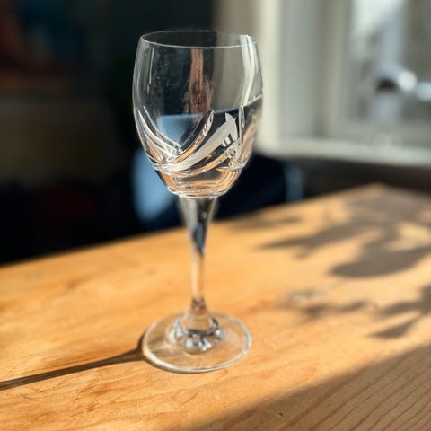 6 stk Bøhmiske vinglas i krystal med slebet mønster. Glassene er i forskellige farver, herunder orange, rød, grøn, blå og lilla nuancer. Hvert glas har klar, dekoreret stilk og fod.