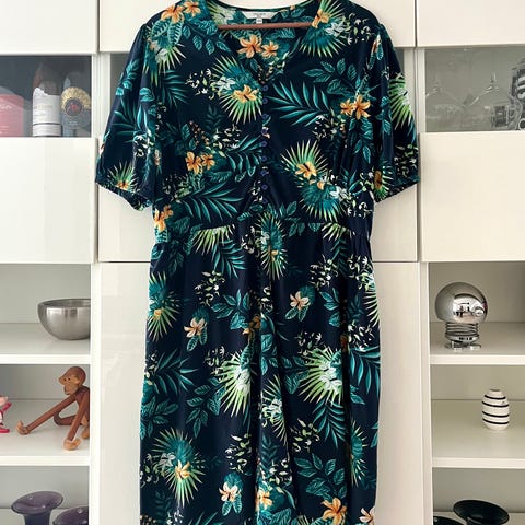 Kjolen har knaplukning foran på brystet og bindebånd nedenunder, samt korte ærmer