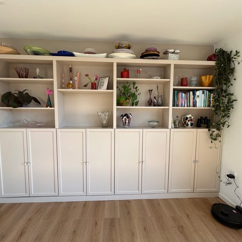 Sælger dette klassiske Billy reolsystem, som er bygget sammen til ét flot, sammenhængende møbel. Systemet er malet, og vi har monteret nye, flotte greb for et mere eksklusivt udtryk.