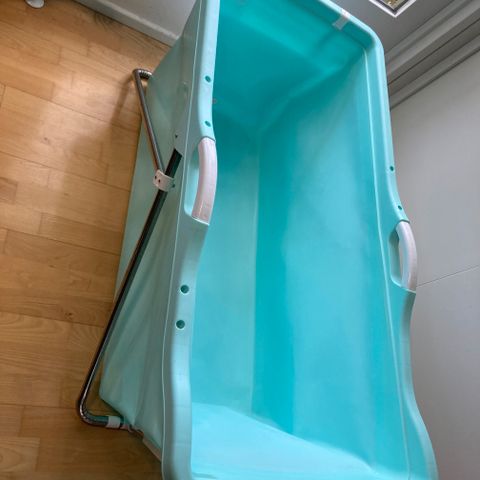150cm Sammenklappeligt badekar til voksne i turkis plast med hvid ramme. Badekarret kan foldes sammen for nem opbevaring og fylder minimalt, når det ikke er i brug. Det har låg, integreret nakkestøtte og stabil understel.