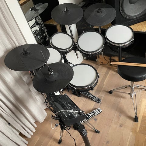 Millenium trommesæt elektronisk med flere trommer og bækkener monteret på stativer. Sættet omfatter elektroniske pads kombineret med akustiske trommer samt et kontrolmodul med faders, knapper og display til styring af lyde og indstillinger. Der medfølger gulvtam, lilletromme, stortromme, hi-hat, ride- og crashpads samt trommestol. Systemet er tilsluttet en aktiv forstærker fra the box (MA120 MKII) med indgange til trommemodulet og mulighed for justering af volumen og klang. Velegnet til øvning og brug i mindre rum, hvor der er behov for elektronisk styring af trommelyd og lydniveau.