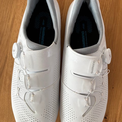 Shimano SH-R088W cykelsko i størrelse 38. Skoene er hvide med sorte detaljer og har lukning med spænde og velcroremme. Modellen er egnet til landevejscykling og er kompatibel med klamper til racercykelpedaler. Overdelen er i syntetisk materiale med ventilationsfelter, og sålen er stiv for effektiv kraftoverførsel. Indersiden er polstret for øget komfort under kørsel. Der står str. 40 men den svarer til en str. 37/38