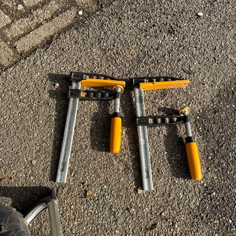 Ukendt mærke skruetvinger og fjederklemme i sort og orange plast/metal. Sættet består af to hurtigspændende skruetvinger med pistolgreb samt en mindre fjederklemme. Egnet til fastspænding af emner ved træarbejde, hobbyprojekter og andre mindre montageopgaver, hvor der er behov for midlertidig fiksering af materialer.