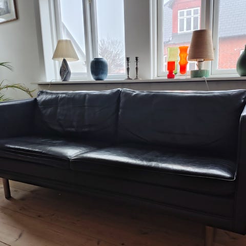 3 Pers., 2 delt Mogens Hansen sofa 210 cm plus puf i sort læder og bøg ben
