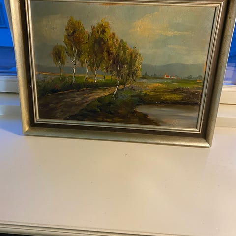 Maleri olie på lærred blågrønne nuancer med huse i landskab