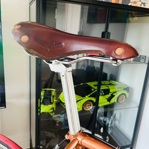 Styr, frempind og sadel er Cinelli. Sadlen er en meget efterspurgt Volare SLX i en sjælden farve.