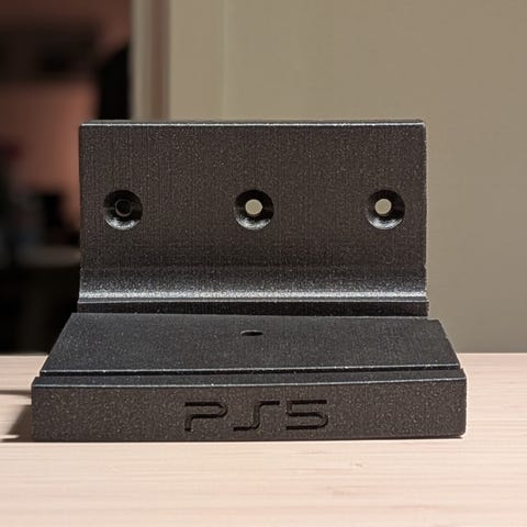 Vægbeslag til PlayStation 5 slim modellen. Sættet indeholder metalbeslag til montering af PS5-konsollen lodret på væggen samt holdere til to DualSense-controllere. På bagsiden af pakken vises monteringsvejledning med skruer, rawlplugs og skruetrækker. Beslaget er beregnet til fast vægmontering for at frigøre plads omkring tv- eller spilleområdet og holde konsol og controllere samlet ét sted.