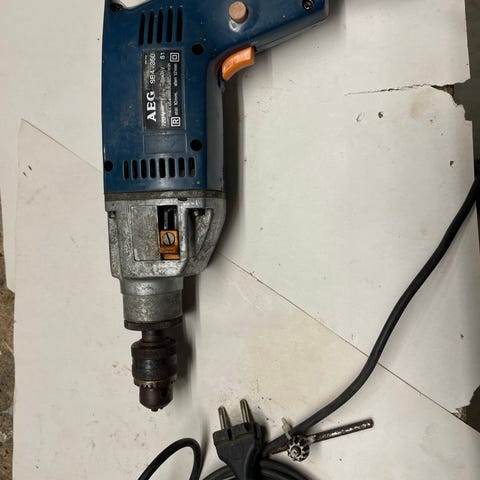 AEG boremaskine med borestativ. El-drevet håndboremaskine monteret i justerbart stativ med fjederbelastet søjle og bordplade med spor til fastspænding af emner. Velegnet til præcisionsboring i værksted eller hobbyrum, hvor en håndboremaskine kan anvendes som søjleboremaskine ved hjælp af stativet.