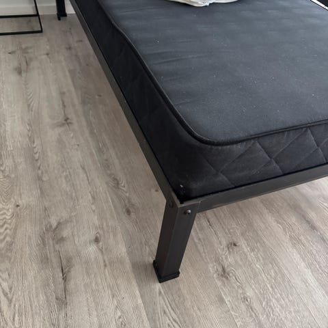 Hay sengeramme med lamelbund. Rammen er af metal, lameller hører med, og vi har selv bygget en støtte i træ til midten for at stive lamellerne af, som også følger med.