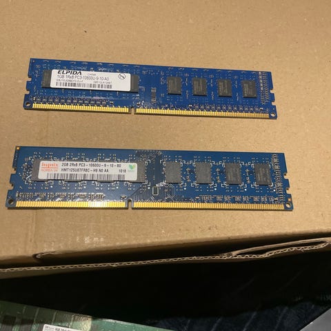 RAM-moduler til stationær pc. Flere moduler i standard desktop-format (DIMM) i grønne og blå printplader. Egnede som hukommelse til stationære computere, f.eks. til opgradering eller udskiftning af eksisterende RAM. Nærmere tekniske specifikationer som kapacitet og hastighed fremgår ikke tydeligt af billederne og bør kontrolleres direkte på modulerne.