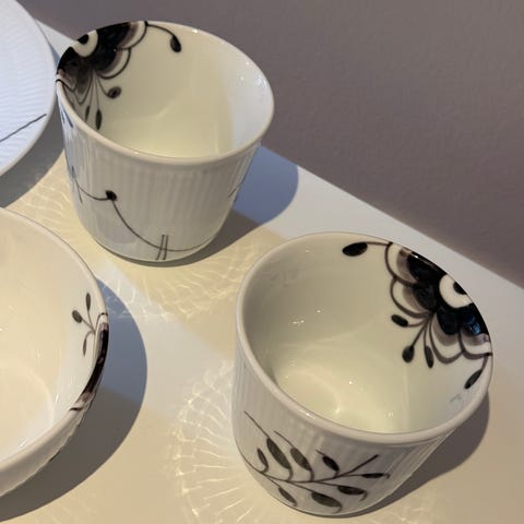 Elegant porcelæn fra Royal Copenhagen sælges. Sættet indeholder: 1 tallerken i Sort Mega Riflet• 1 krus i Blå Mega Riflet• 2 kopper i Sort Mega Riflet•