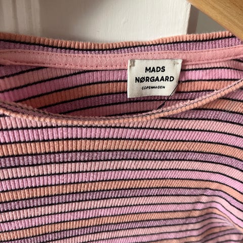 Bluse, Bluse, t-shirt, Mads Nørgaard, str. 128, Str. 8 år. Mads Nørgaard - den klassiske sømandstrøje i tyndt, lysegråt strik - og en lækker neonlimegul t-shirt. Hhv 200 og 100 kr.