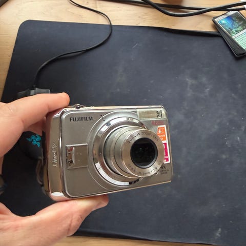Samsung Digimax A4 digitalkamera i sølvfarvet plast/metal-look. Kompakt model med indbygget zoomobjektiv, indbygget blitz og skærm på bagsiden til visning af billeder og menuindstillinger. Kameraet har håndledsrem monteret. Egnet til almindelig hverdagsfotografering og rejsebrug. Strømforsynes af batterier (ses på billederne). Flere fysiske knapper på toppen og bagsiden til betjening af zoom, udløser og menufunktioner. Testet og fungerer som det skal - medfølger nye batterier.