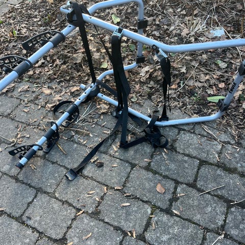 Cykelholder til montering på bilens bagklap. Stativ i metal med plastbeslag til fastgørelse af cykler. Justerbare arme og remme til at holde cyklerne på plads.