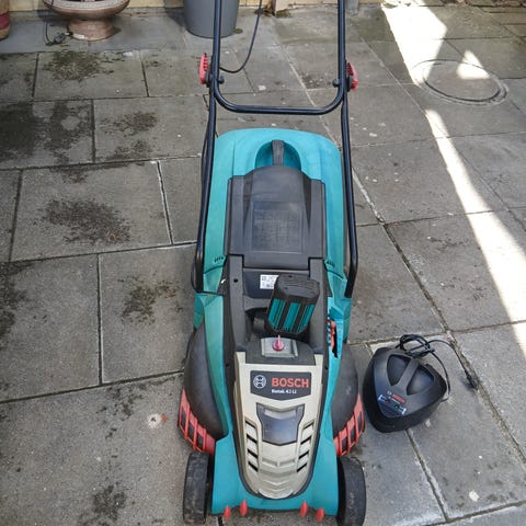 Bosch Rotak plæneklipper og græstrimmer sæt med batterier og lader grøn