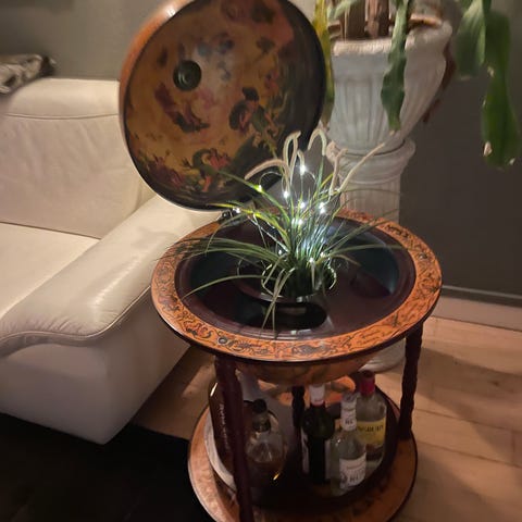 Globus barbord i brun trælook med opbevaringsplads til flasker og glas indvendigt i globussen samt på den nederste hylde. Globussen har klassisk verdenskortmotiv udvendigt og dekorative illustrationer indvendigt. Bordet står på tre drejede ben og er velegnet som bar- og opbevaringsmøbel i stue eller spisestue.
