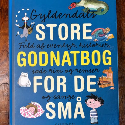 Gyldendal Gyldendals store godnatbog børnebog. Indbundet bog med godnathistorier, eventyr, rim, remser og sange til mindre børn. Velegnet som højtlæsningsbog ved sengetid og til fælles læsning med voksne. Teksten er ledsaget af illustrationer på omslaget, som signalerer indhold målrettet de mindste børn.