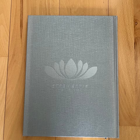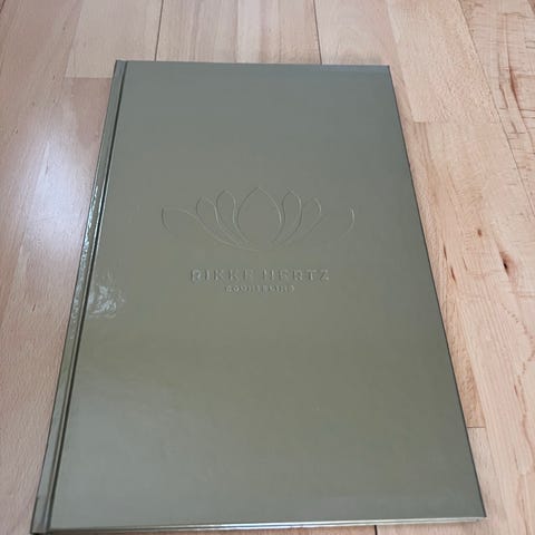 Emne: Personlig udvikling. Hvid notesbog med præget lotusmotiv på forsiden. Bogen har hårdt omslag.