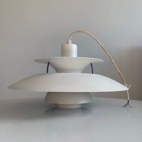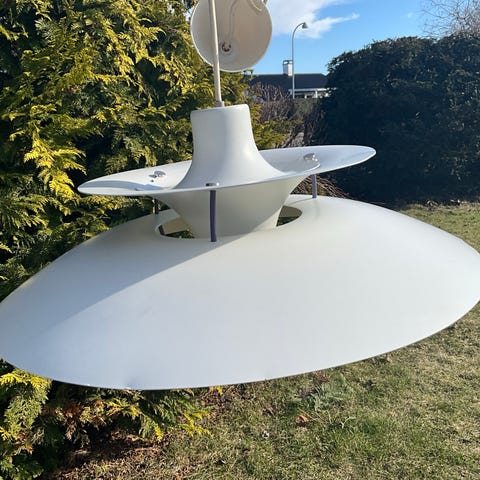Ældre PH5-pendel sælges. Den har brugsspor i form af få ridser, en lille malerplet og lidt skævheder, men den fremstår overordnet i god stand.