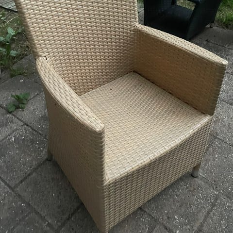 Havestole i brun flet med armlæn. Stolen har høj ryg der er indstillelig og kan vippes til næsten liggende stilling. Sædet og ryglænet er udført i flettet materiale, men fletværket er bristet fortil på begge stole i sædet og højt på ryggen.