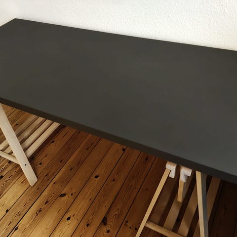 Fint, funktionelt skrivebord eller gamerbord fra IKEA. Det måler 80x160 cm og har derfor masser af plads til ekstra skærme, notesbøger og andet skrivebordsinventar. På undersiden er der et net, der kan bruges til at få ledninger o.lign. væk fra gulvet. Kan justeres manuelt i højden.