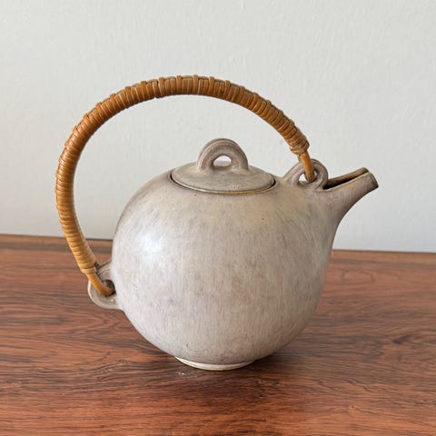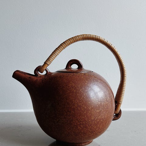 Saxbo tekande i brunt stentøj. Tekanden har rund form med låg og hank, der er viklet med materiale for bedre greb. Overfladen har en varm, brun glasur med let spil i farven. Velegnet til servering af te eller som dekorativt indslag i køkken eller spisestue. Bundmærkning med Saxbo-stempel og modelnummer.
