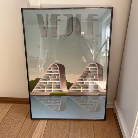 Plakaterne forstiller henholdsvis Storebæltsbroen og Bølgen i Vejle og rammerne er fra IKEA af modellen ‘Lomviken’ i sort.
