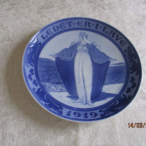 Royal Copenhagen Mindeplatte Udgivelsesår: 1919 Oplag: 3488 eksemplarer , diameter: 22,5 cm Motiv / Produceret i anledning af: Fredsplatte. Mor og søn ser mod op- gående sol. Tekst: FOR ANDEN GANG JORD AF HAVET GRØN OG HERLIG SER OP- STIGE - VØLVENS SPÅDOM.