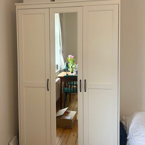 Klædeskab med en fast hylde midt i skabet, samt tre flytbare hylder (ingen stang til ophæng). Måler 1,94 m i højden, 60 cm i bredden, samt 60 cm i dybden. Der følger desuden en sokkel med, så det kan hæves fra gulvet. Det nederste hængsel mangler et led (se billede), så det skal nok skiftes. Blev til overs, da flyttemænd ikke ville bære det op ovenpå i ny lejlighed. Skal bare væk. Skal afhentes i Skejby, bæres eller trilles ud på sækkevogn fra stueetage.