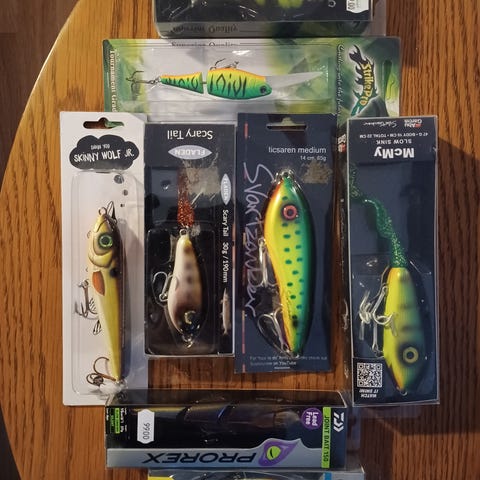 20 stk super gedde agn, de 6 første billeder, er af de håndlavede. super lækker kvalitet agn, af Nicklas mollerup. Kun samlet salg. Fast pris. 1000 kr. For alle 20 agn.