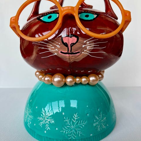 kattefigur i blå nuancer i træ. Figuren er stiliseret med lang krop og markeret hoved og ører. Overfladen har en glasurlignende finish med spil i farven. Egnet som dekoration i stue, entré eller på hylde og vindueskarm.