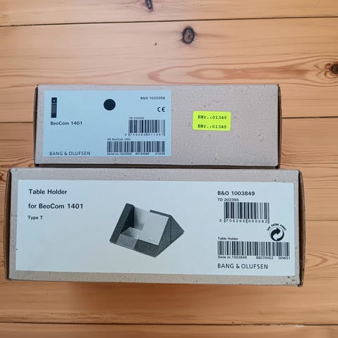 B&o Beo Talk bordtelefon med strømforsyning og ledninger.