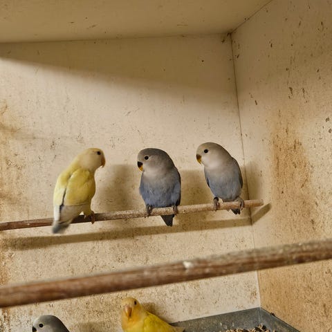 2 Stk. Sorthovedet Dværgpapegøjer i blå farver. Unger der lige er begyndt at spise selv. Pris pr. stk.