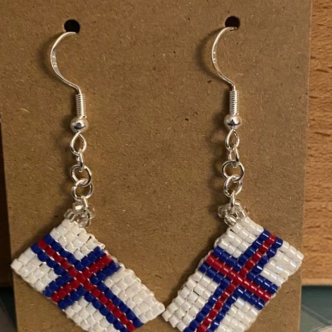 Håndsydede øreringe af det færøske flag, også kaldt mærket. Flagene er syet med toho perler og ørestikkerne er sølvbelagt stål s925