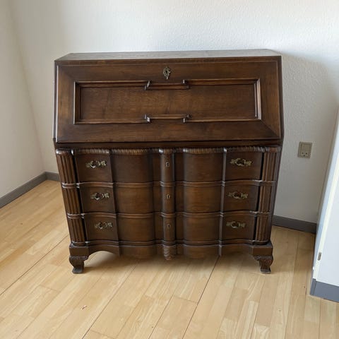 Skrivekommode i fyrretræ med klap og flere skuffer. Møblet har en nedklappelig skriveplade, der holdes af udtræksstøtter i siderne. Indvendigt er der små skuffer og rum til opbevaring af papirer og mindre genstande. Under skriveklappen er der flere større skuffer med greb. Overfladen er lakeret, så træets struktur og varme tone er synlig. Egnede anvendelser er som arbejdsplads, opbevaring i stue, kontor eller soveværelse.