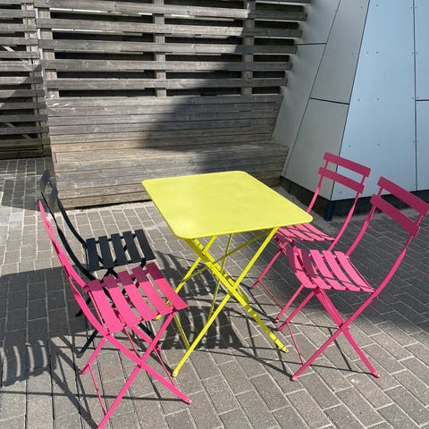 Lækkert sæt bestående af bænk, to stole samt bord, i lækker grøn farve. Kan stå ude i al slags vejr og kan let klappes sammen.