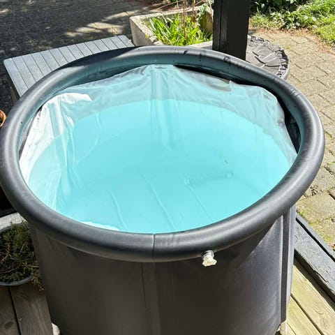 Polax isbad transportabelt koldt bad i sort. Tøndeformet kar med vandtæt inderforing og ydre overtræk med snørelukning i toppen. Velegnet til isbade og koldtvandsterapi udendørs eller indendørs. Medfølgende tilbehør som vist på billederne, herunder pumpe/ventildele og poser med epsom salt til brug i badet.
