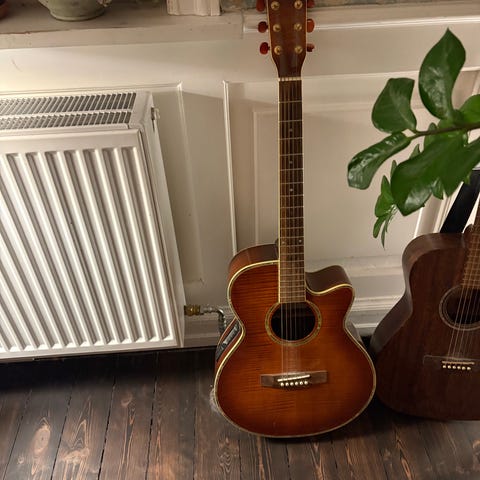 Framus 12-strenget guitar i dreadnought-form med brun sunburst-lakering på forsiden og mørk bagside. Akustisk model med 12 stemmeskruer monteret på hovedet og bolt-on halsfæste bagpå kroppen. Velegnet til akustisk spil, akkompagnement og brug med fingerspil eller plektre. Kroppen har pickguard monteret ved lydhullet og traditionel brokonstruktion til 12 strenge.