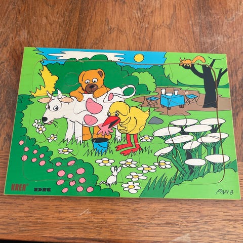 Krea børnepuslespil med motiv af en bjørn på en bro ved en sø, omgivet af dyr og natur. Puslespillet består af brikker i kraftig papkvalitet, velegnet til mindre børn. Farverigt motiv, der kan støtte udvikling af finmotorik og formgenkendelse.