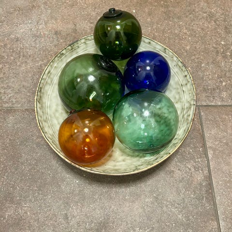 Gammel glaskugle ø ca 11,5, grønt glas. Er blevet brugt af fiskerne i gamle dage, så den har lidt brugsspor og der hvor den er cuttet af har den et lille nips, se sidste billede.