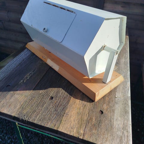 Boksen står på en fast bundplade og har et hængslet låg øverst, der åbnes opad.