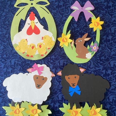 &Tradition påske dekorationer papfigurer. Sættet består af udklippede påskemotiver i farvet karton/pap, herunder kyllinger og påskekrans med kanin og blomster. Velegnet som ophæng eller vægpynt til påske. Farverne er flerfarvede med gule, grønne, lilla og rosa nuancer. Egnet til indendørs brug som sæsonpynt i hjem, institution eller klasseværelse🐣🐣