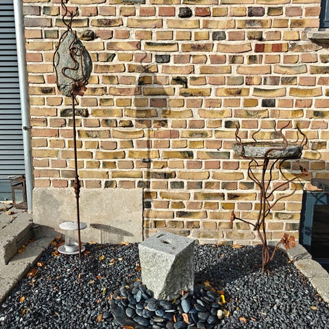 Havefigur sæt med to traner i metal i grønlig patineret farve. Figurerne forestiller stående fugle med lange ben og hals, hvor den ene har bøjet hals og den anden strakt hals. Velegnet som dekoration på terrasse, altan eller i haven. Stabil fod med fire tæer på hver figur, som kan placeres på fast underlag.