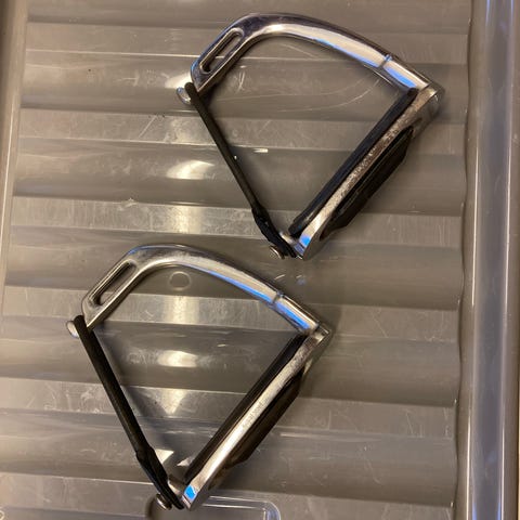 Kwik-Out stigbøjler - sikkerhedsstigbøjler i metal. Modellen har sikkerhedsmekanisme i siden, der kan åbne ved belastning. Overfladen er i blankt metal med indsatser til fodfæste. Velegnet som stigbøjler til sadel, hvor der ønskes ekstra sikkerhed ved ridning.