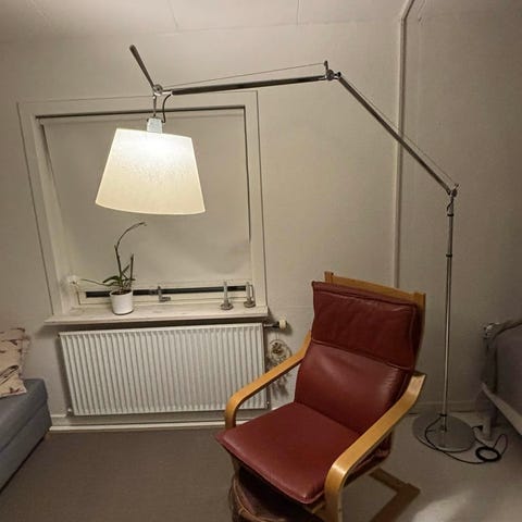 Artemide gulvlampe designet af Michele De Lucchi. Lampen har en lang, justerbar arm i metal, der giver mulighed for at regulere lysretningen over f.eks. sofa eller bord. Den runde fod i metal sikrer stabilitet. Lampen er udstyret med en kegleformet skærm og har fodkontakt på ledningen til tænd/sluk. Velegnet som belysning i stue eller læsehjørne.