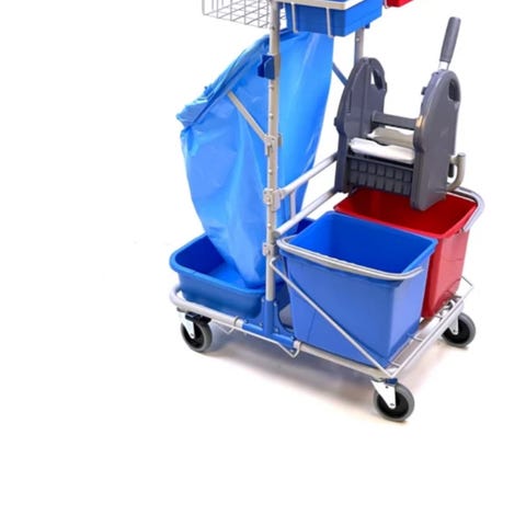 Rengøringsvogn i metal med plastdele i blå. Vognen er udstyret med blå spande, trådkurv og hylder til opbevaring af rengøringsmidler og udstyr. Konstruktionen har hjul for nem transport på hårde gulve. Egnet til brug sammen med mopper, koste og andet rengøringsudstyr i fx institutioner, kontorer eller større private arealer.