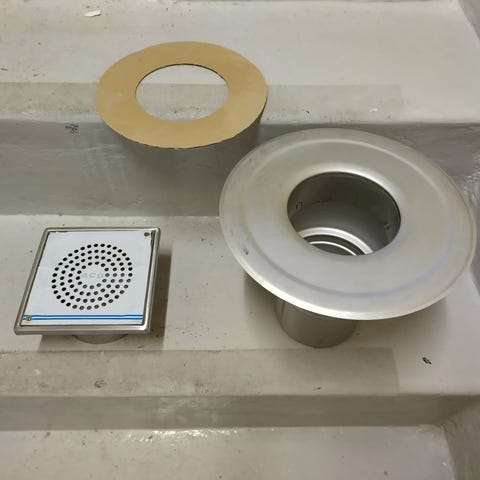 Afløbsskål, ACO 'Pro drain', rustfri afløbsskål til vinylgulv med 3 sideindløb (med 2 sæt gummiindserts) og 75 mm sideafløb